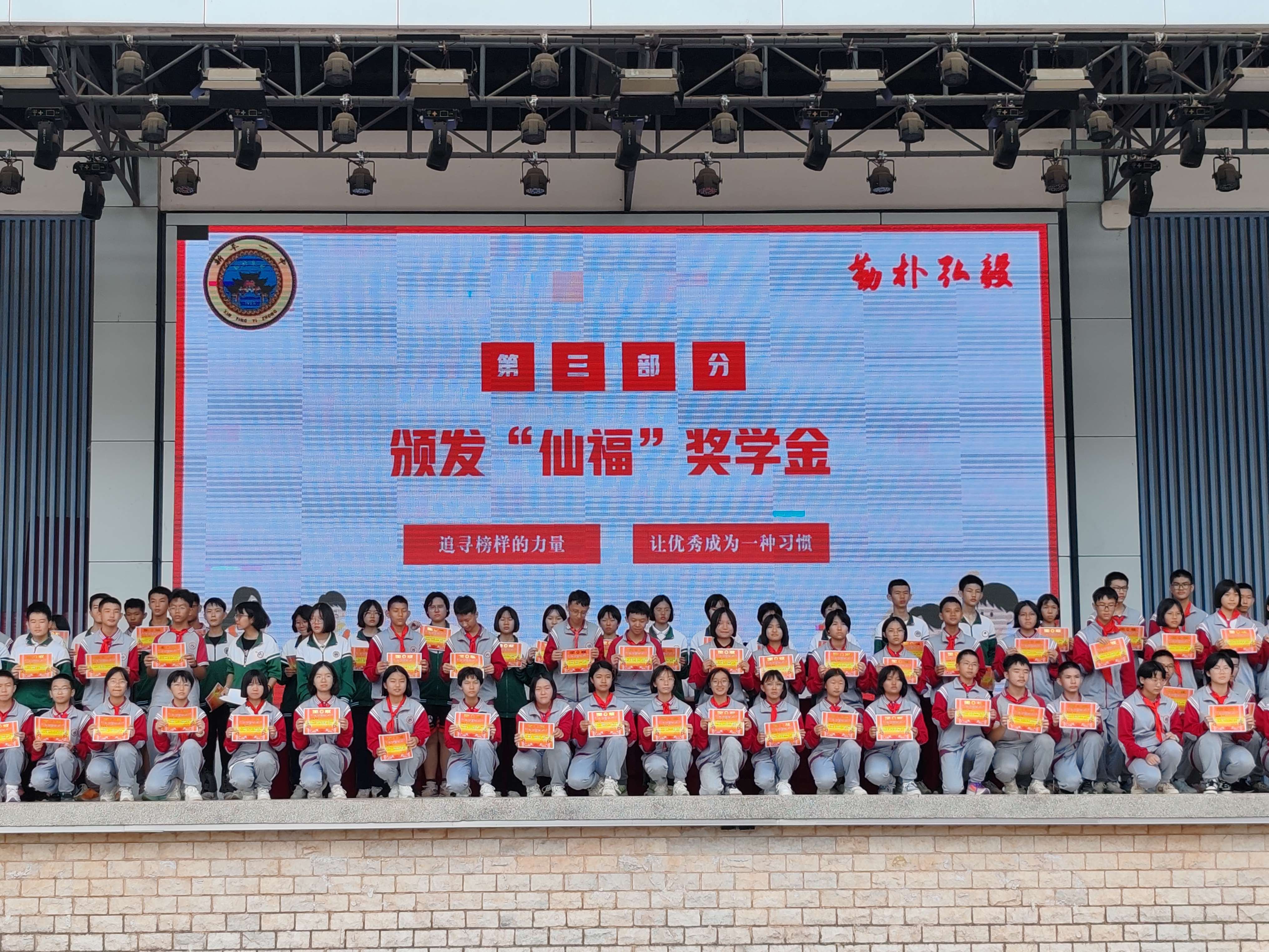 在新平一中2023-2024學年秋季學期開學典禮上,云南玉溪仙福鋼鐵(集團)有限公司向學生頒發“仙福獎學金”,獎學金根據學生成績設置了不同額度,以此來肯定品學兼優的學子,激勵更多的學子樹立堅定目標,滿載美好的希望和愿景,開啟新的征程。
