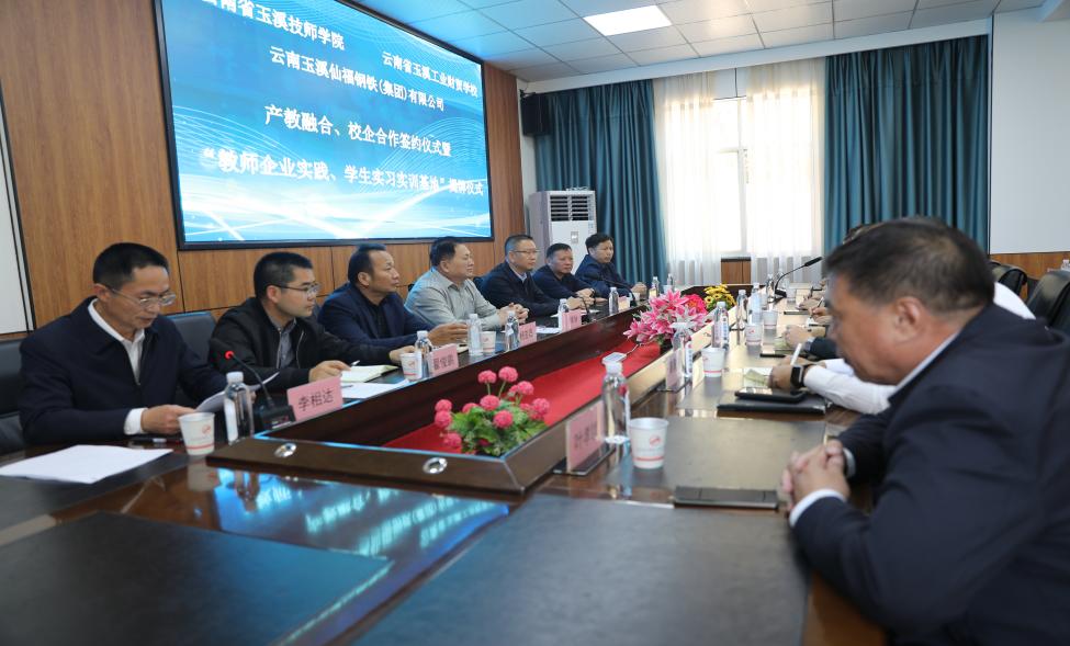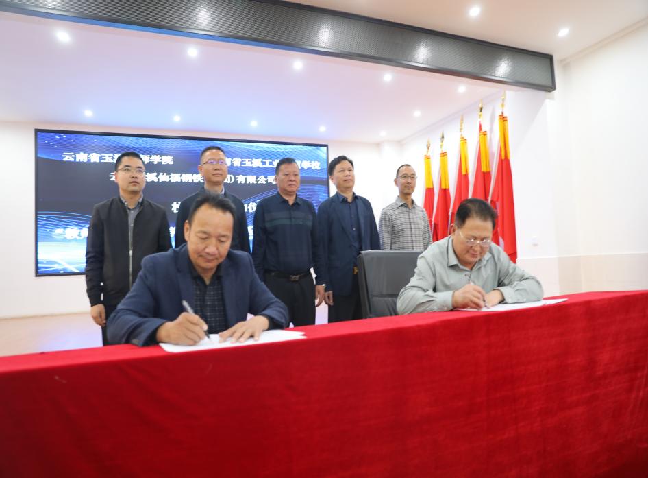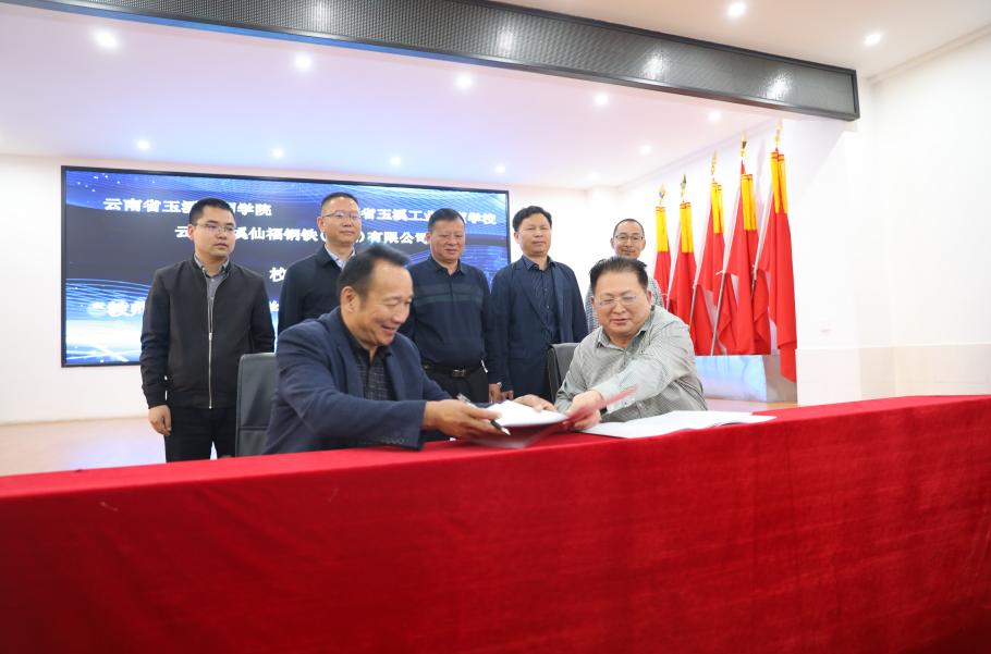 云南玉溪仙福鋼鐵(集團)有限公司李枝官總經(jīng)理和云南省玉溪技師學(xué)院楊寶嘉院長、雙方進行“產(chǎn)教融合、校企合作”簽約。